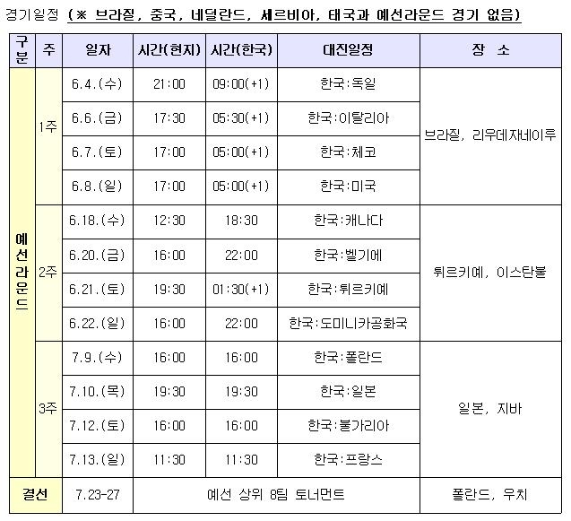다만, 예선 라운드에서 태국, 중국, 브라질, 네덜란드, 세르비아와는 맞붙지 않는다.