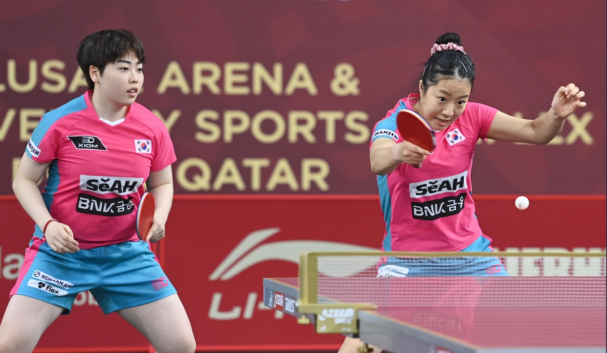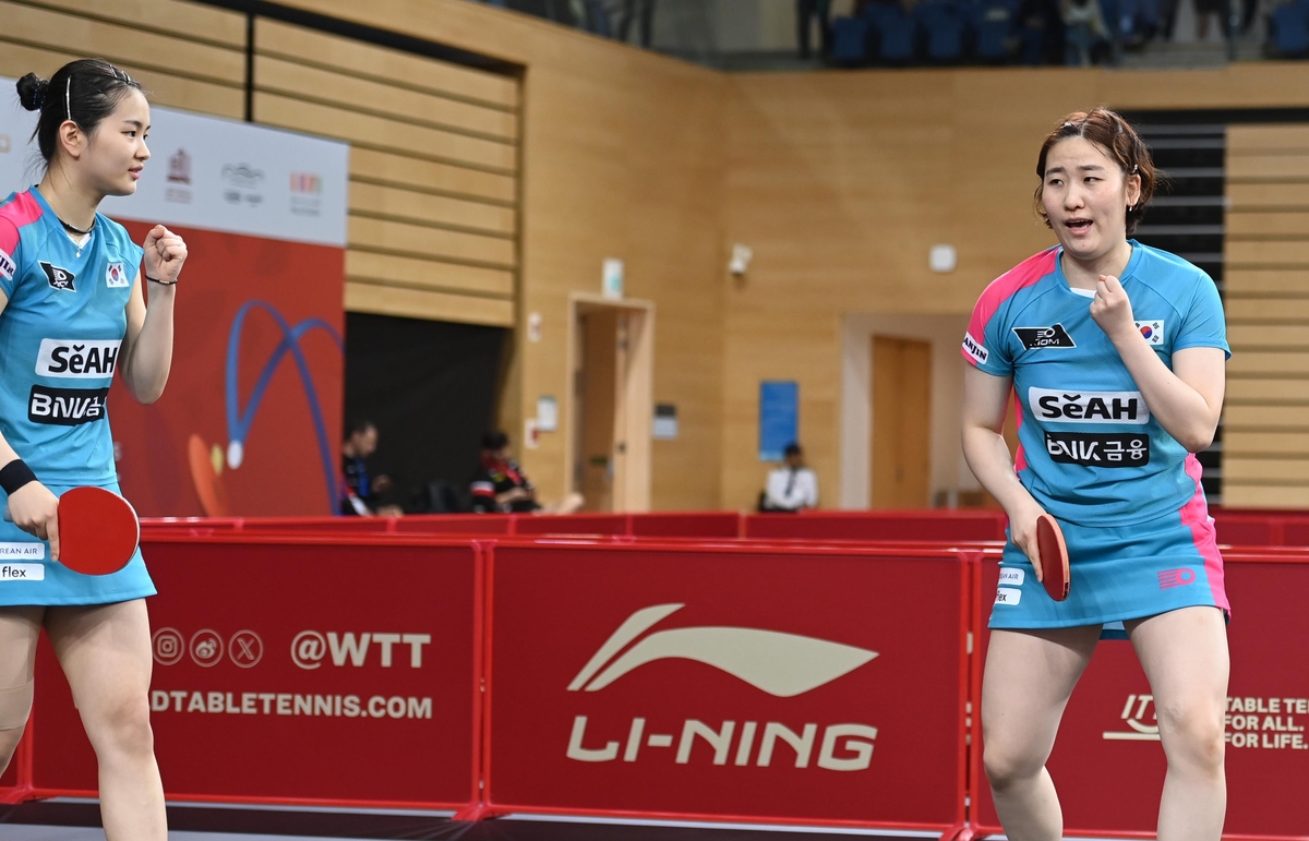 신유빈-유한나 조는 20일 오전(한국시간) 카타르 도하의 루사일 스포츠아레나에서 열린 대회 여자복식 32강에서 조지나 포타(헝가리)-사라 드 누트(룩셈부르크)를 3-0(11-3 11-7 11-4)으로 완파했다.