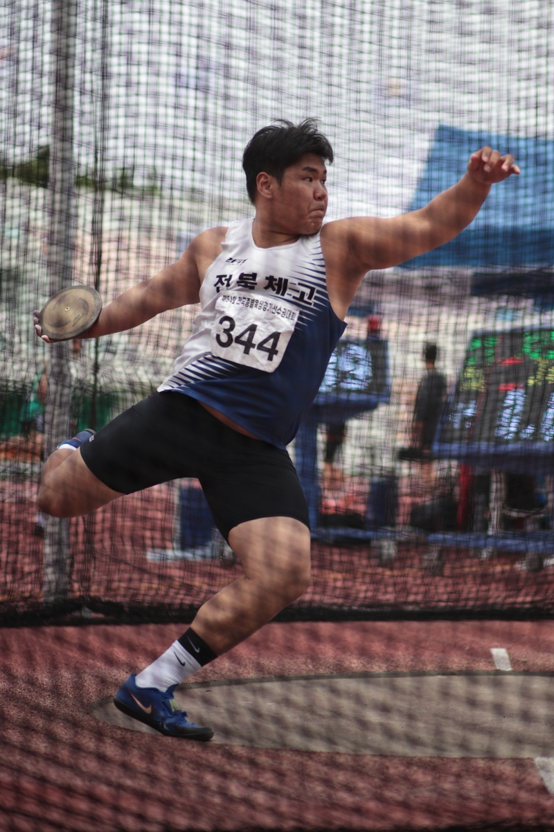 (서울=연합뉴스) 이태우가 23일 경남 밀양종합운동장에서 열린 제54회 전국종별육상경기선수권 남자 고등부 원반던지기 경기에서 투척 동작을 하고 있다. [대한육상연맹 제공. 재판매 및 DB 금지]