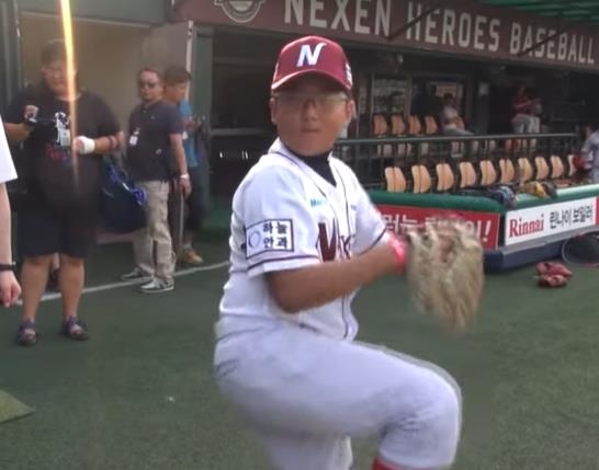 LG 트윈스 좌완 투수 송승기가 안산 삼일초 6학년에 재학 중이었던 2014년 8월 15일 서울 목동구장에서 열린 프로야구 넥센 히어로즈(현 키움)와 두산 베어스의 경기에서 시구를 앞두고 몸을 풀고 있다. [키움 히어로즈 유튜브 채널 캡처. 재배포 및 DB 금지]