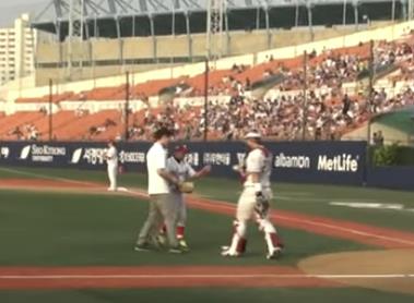 송승기는 시구한 뒤 박동원으로부터 시구한 공을 건네받기도 했다.