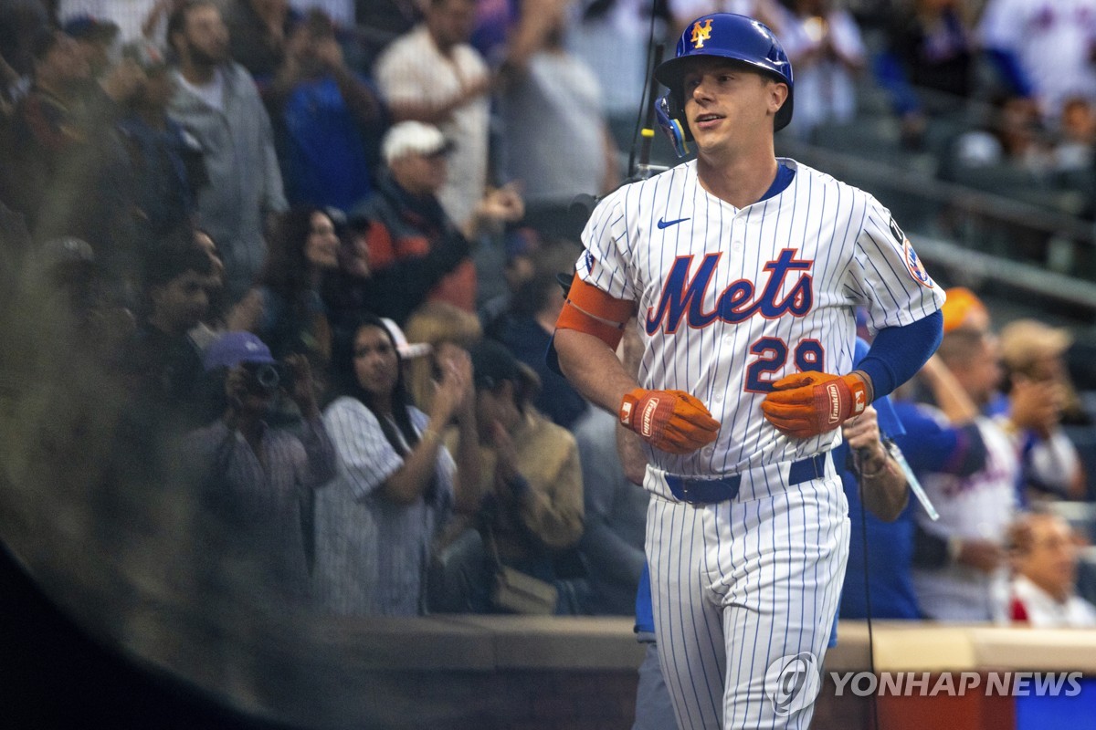 (뉴욕 AP=연합뉴스) 재러드 영이 28일(한국시간) 미국 뉴욕 시티필드에서 열린 메이저리그 시카고 화이트삭스와 홈 경기, 1회말 투런 홈런을 친 뒤 더그아웃으로 들어오고 있다.