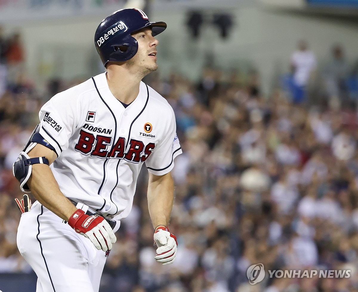 (서울=연합뉴스) 김도훈 기자 = 24일 서울 잠실야구장에서 열린 2024 프로야구 NC 다이노스와 두산 베어스의 경기. 5회말 무사 1루 두산 제러드가 투런 홈런을 쳐낸 뒤 베이스를 돌고 있다. 2024.9.24 superdoo82@yna.co.kr