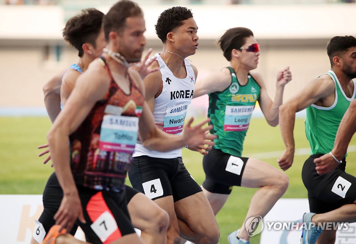 (구미=연합뉴스) 김현태 기자 = 28일 오후 경북 구미시민운동장에서 열린 2025 아시아육상경기선수권대회 남자 100m 준결선에서 나마디 조엘진(19·예천군청)이 전력질주하고 있다. 2025.5.28 mtkht@yna.co.kr