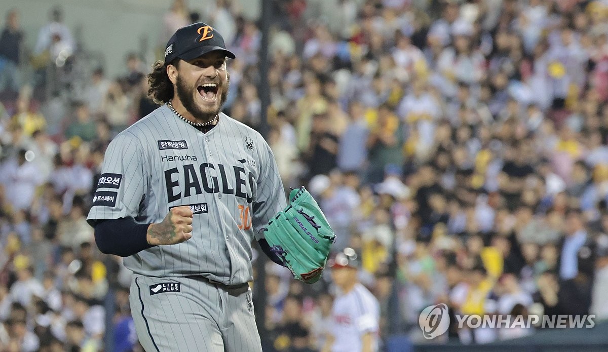 (서울=연합뉴스) 김인철 기자 = 28일 서울 송파구 잠실야구장에서 열린 2025 프로야구 KBO리그 한화 이글스와 LG 트윈스의 경기. 6회말 2사 2루 한화 선발 폰세가 LG 오스틴을 좌익수 플라이 아웃으로 처리한 뒤 기뻐하고 있다. 2025.5.28 yatoya@yna.co.kr