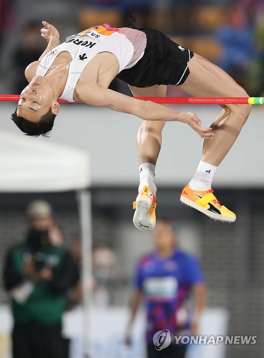 (구미=연합뉴스) 김현태 기자 = 29일 오후 경북 구미시민운동장에서 열린 2025 아시아육상경기선수권대회 남자 높이뛰기 결선에서 우상혁(용인시청)이 2m23을 넘고 있다. 2025.5.29 mtkht@yna.co.kr