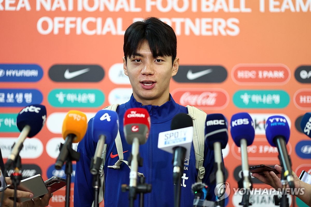 (영종도=연합뉴스) 윤동진 기자 = 대한민국 축구대표 전진우가 2일 인천국제공항 제1터미널을 통해 이라크로 출국하기에 앞서 인터뷰하고 있다. 2025.6.2 mon@yna.co.kr