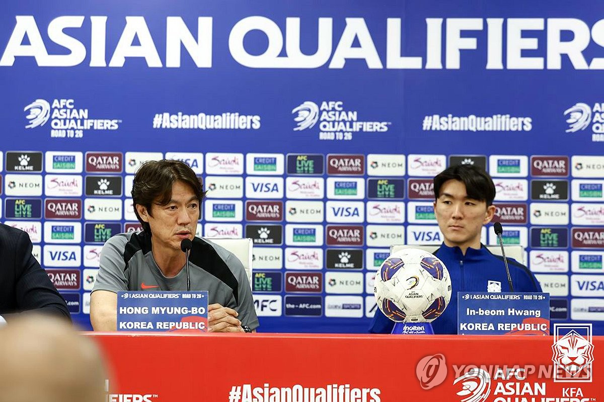 (서울=연합뉴스) 5일(현지시간) 이라크 바스라국제경기장에서 열린 2026 FIFA 북중미 월드컵 3차 예선 한국 대 이라크 공식 기자회견에서 홍명보 한국 대표팀 감독이 발언하고 있다. 2025.6.5 [대한축구협회 제공. 재판매 및 DB 금지] photo@yna.co.kr