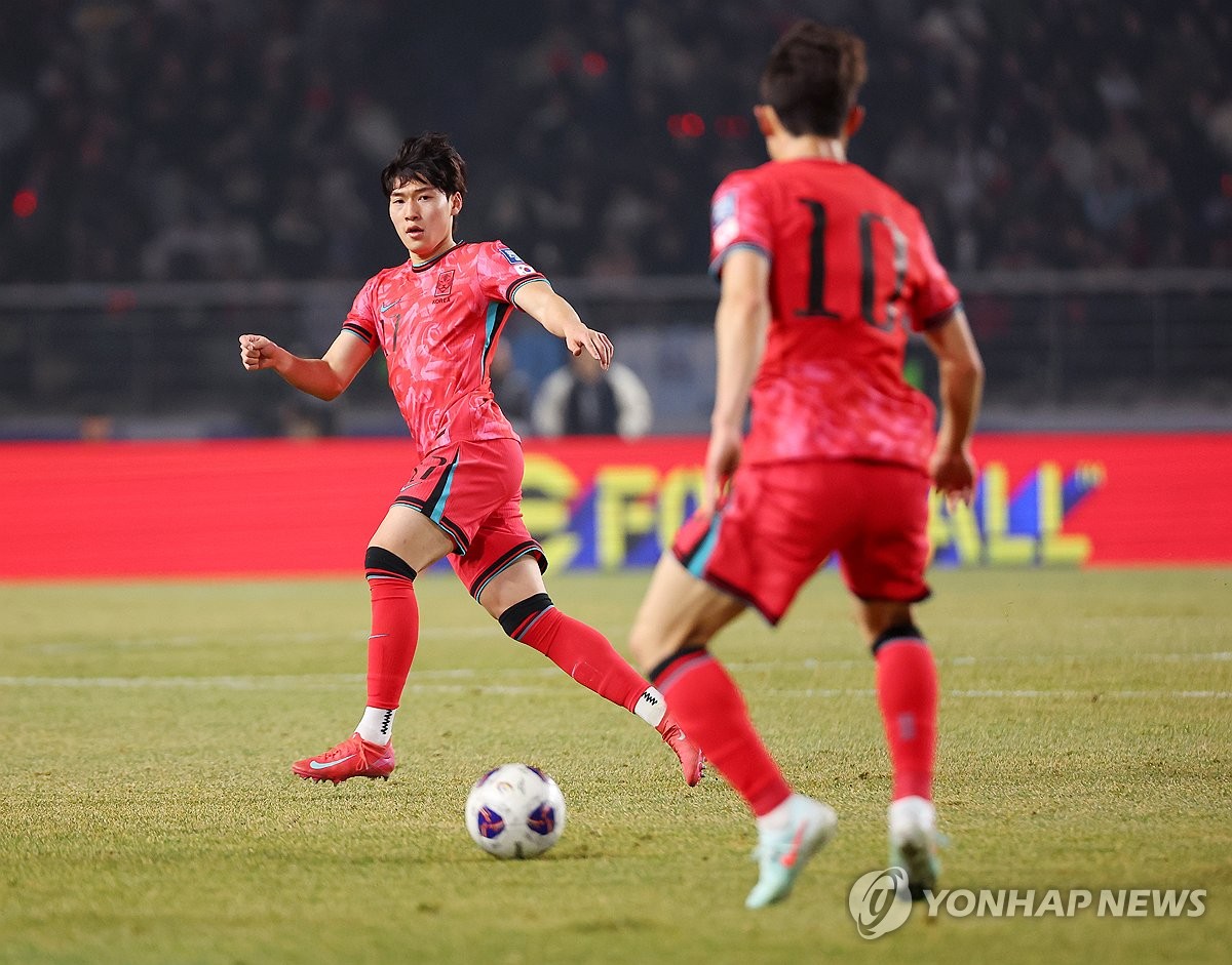 (고양=연합뉴스) 김도훈 기자 = 20일 경기도 고양종합운동장에서 열린 2026 북중미 월드컵 아시아 3차 예선 B조 7차전 대한민국과 오만의 경기. 배준호가 이재성을 향해 패스를 시도하고 있다. 2025.3.20 superdoo82@yna.co.kr