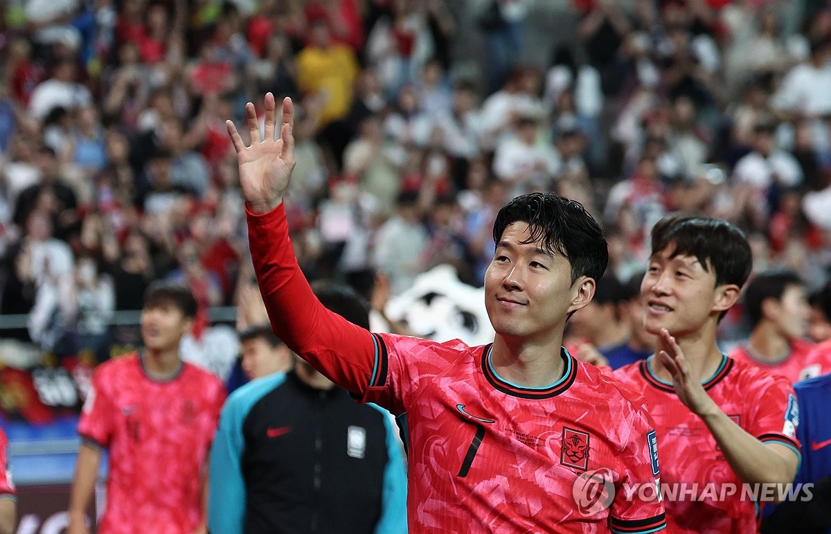 (서울=연합뉴스) 김인철 기자 = 10일 서울월드컵경기장에서 열린 2026 북중미 월드컵 아시아 3차 예선 최종전 한국과 쿠웨이트의 경기. 11회 연속 월드컵 본선 진출에 성공한 한국 대표팀의 손흥민과 이재성이 그라운드를 돌며 팬들에게 인사하고 있다. 2025.6.10 yatoya@yna.co.kr