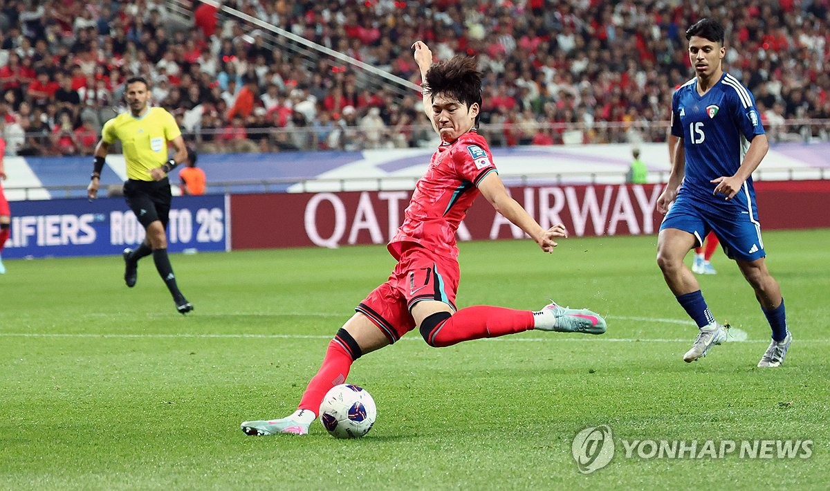 (서울=연합뉴스) 김인철 기자 = 10일 서울월드컵경기장에서 열린 2026 북중미 월드컵 아시아 3차 예선 최종전 한국과 쿠웨이트의 경기. 한국 배준호가 슛을 시도하고 있다. 2025.6.10 yatoya@yna.co.kr