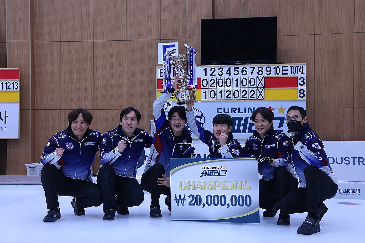 (서울=연합뉴스) 9일 경기도 의정부컬링장에서 열린 2024-2025 컬링 슈퍼리그 남자부 결승 3차전에서 강원도청을 물리치고 우승을 차지한 경북체육회(스킵 김수혁, 서드 김창민, 세컨드 유민현, 리드 김학균, 핍스 전재익)선수들이 트로피를 들고 환호하고 있다. 2025.1.9 [대한컬링연맹 제공. 재판매 및 DB 금지] photo@yna.co.kr