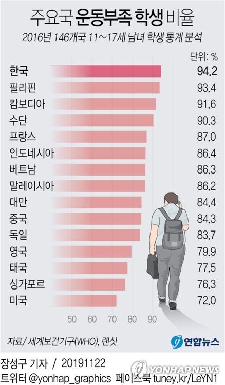 2019년 세계보건기구(WHO)가 146개국을 대상으로 2016년의 국가 간 청소년 신체활동 부족률을 비교한 결과, 운동 부족으로 분류된 학생 비율이 94.2%로 조사국 중 가장 높은 수준이었다.