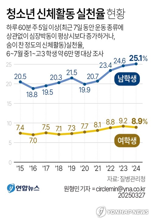 여학생은 무려 97.2%로, 사실상 전원이 신체·정신건강 유지와 발달에 충분한 신체활동을 하지 않는 걸로 나타났다.