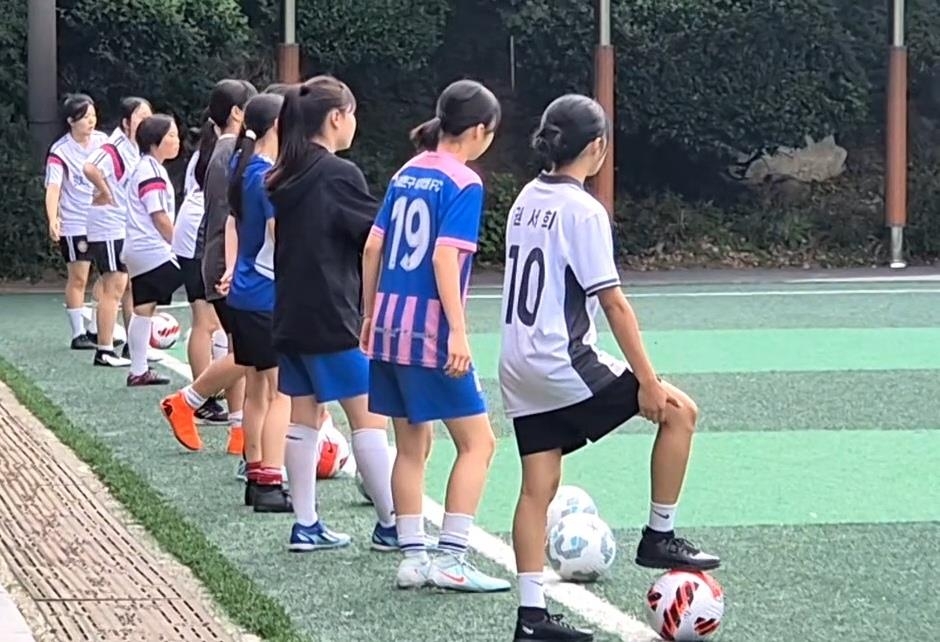 인근의 각 학교에서 구산중을 찾은 여학생 15명이 덕성여고 교사인 전해림 씨의 지도에 따라 트래핑과 패스, 드리블 등 기본기를 연습하려 바쁘게 발을 움직였다.