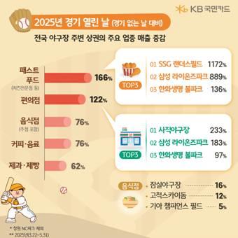 경기일 전국 9개 야구장 주변 상권의 5대 주요 업종 매출액은 2022년(4월 2일부터 6월 11일까지 70일간) 대비 2023년(4월 1일부터 6월 10일까지 70일간)엔 13%, 2024년(3월 23일부터 6월 1일까지 70일간)엔 25%, 2025년엔 31% 증가한 것으로 집계됐다.