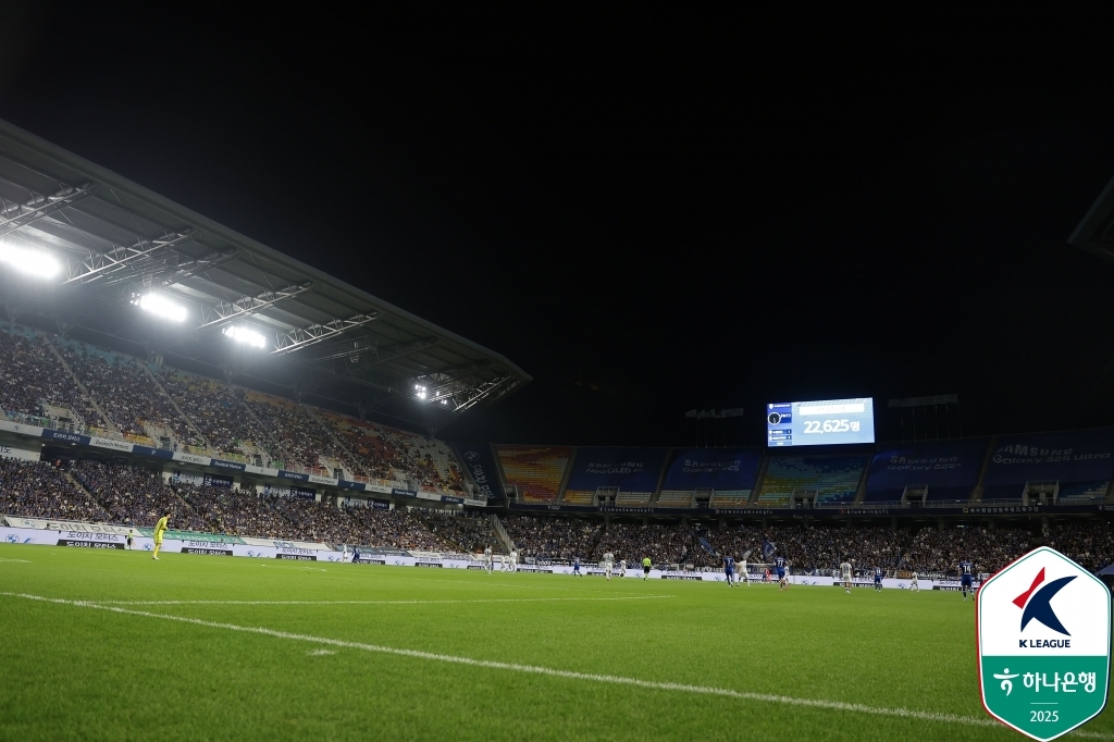 15일 수원과 인천의 하나은행 K리그2 2025 16라운드 경기가 열린 수원월드컵경기장엔 공식 집계 기준 2만2천625명의 관중이 입장했다.