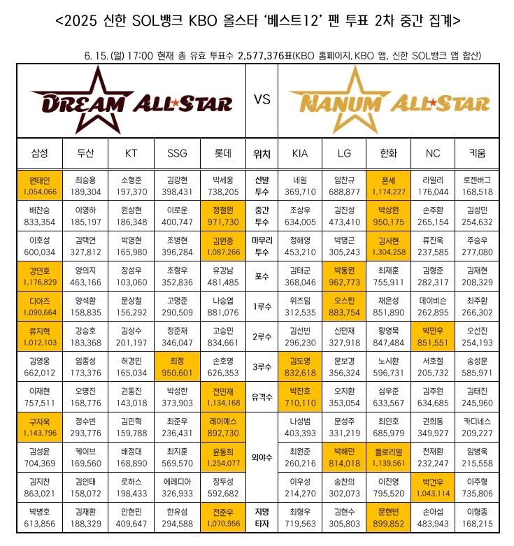 2025 KBO 올스타전에 출전할 베스트12을 뽑는 팬 투표는 22일 오후 2시까지 진행되며, 팬 투표(70%)와 선수단 투표(30%) 결과를 합산한 최종 베스트12 명단은 23일 발표할 예정이다.