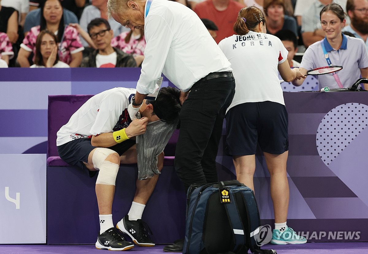 경기 도중 메스꺼움을 호소하던 김원호가 구토하고 있다. 2024.8.2 hama@yna.co.kr