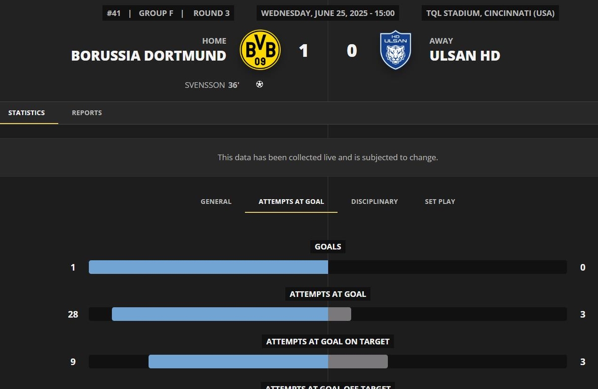 FIFA 데이터 플랫폼에 따르면 도르트문트는 울산을 상대로 슈팅 28개를 쏟았다. 이 가운데 9개가 유효슈팅이었다.