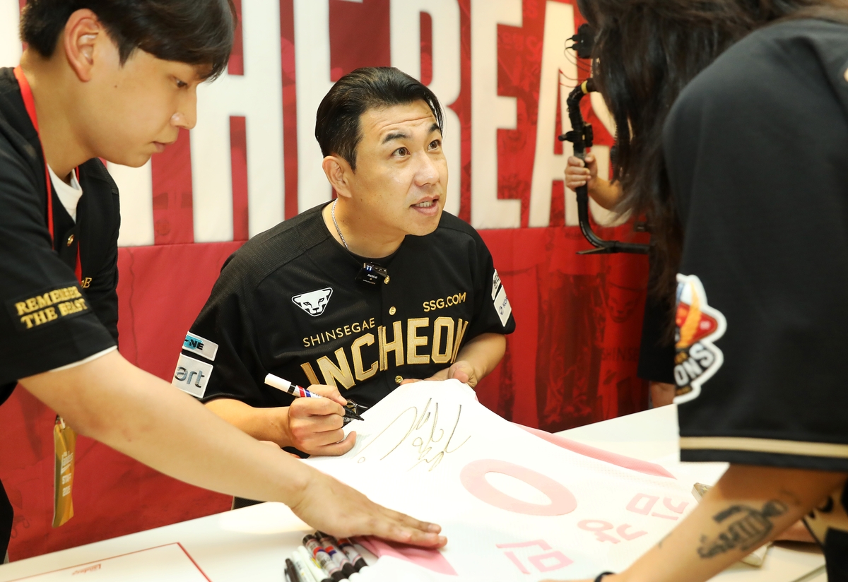 (서울=연합뉴스) 김강민이 28일 인천 SSG랜더스필드에서 열린 자신의 은퇴식을 앞두고 팬들에게 사인을 해주고 있다. [SSG 랜더스 제공. 재판매 및 DB금지]