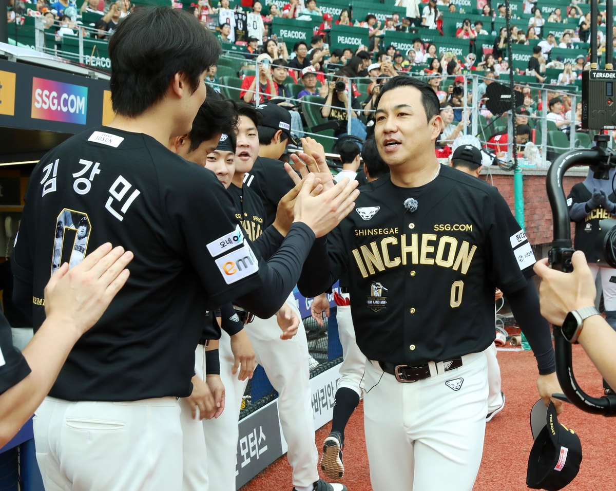 (서울=연합뉴스) 김강민이 28일 인천 SSG랜더스필드에서 열린 자신의 은퇴식에 SSG 특별 엔트리로 등록돼, 중견수로 선발 출전했다가 교체된 뒤 SSG 선수들과 인사하고 있다. [SSG 랜더스 제공. 재판매 및 DB금지]