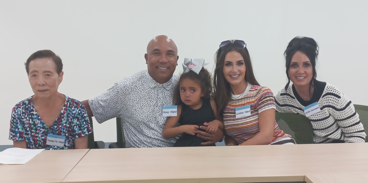 (부천=연합뉴스) 박현수 기자 = 지난 29일 경기 부천시립박물관에서 열린 '2025 하인즈 워드와 함께하는 희망의 터치다운' 행사에 하인즈 워드와 함께 참석한 가족들. 왼쪽부터 하인즈 워드 어머니 김영희 여사, 하인즈 워드, 딸 론딘 워드, 아내 린제이 워드, 장모 재키 게오갈라스. 2025.6.29 phyeonsoo@yna.co.kr