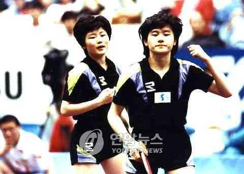 사상 첫 탁구 남북 단일팀이 성사됐던 1991년 일본 지바 세계탁구선수권 때 여자 단체전 세계 제패를 합작했던 현정화와 이분희 선수. [연합뉴스 자료 사진]