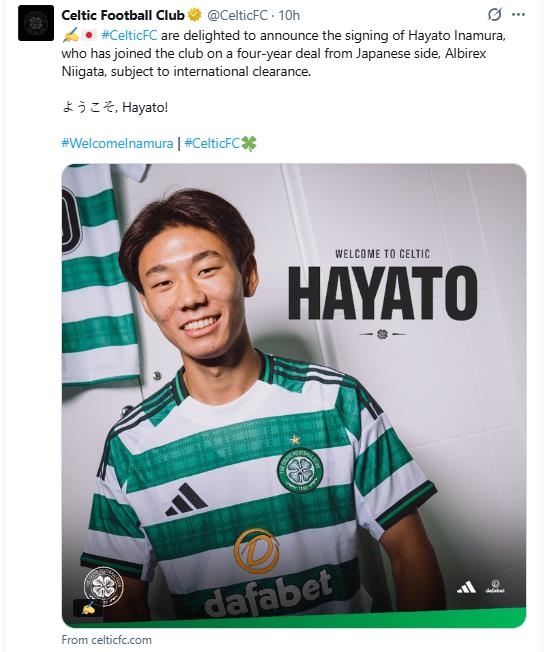셀틱은 5일(한국시간) 일본 프로축구 J1리그 알비렉스 니가타의 이나무라를 영입했다"고 알렸다. 계약 기간은 4년이다.