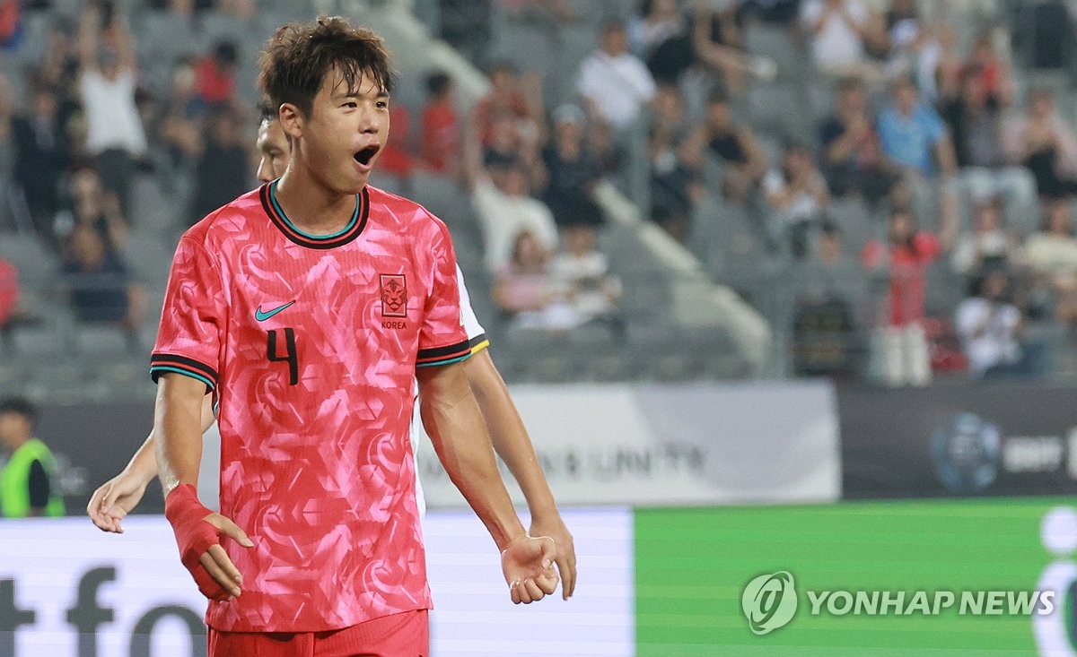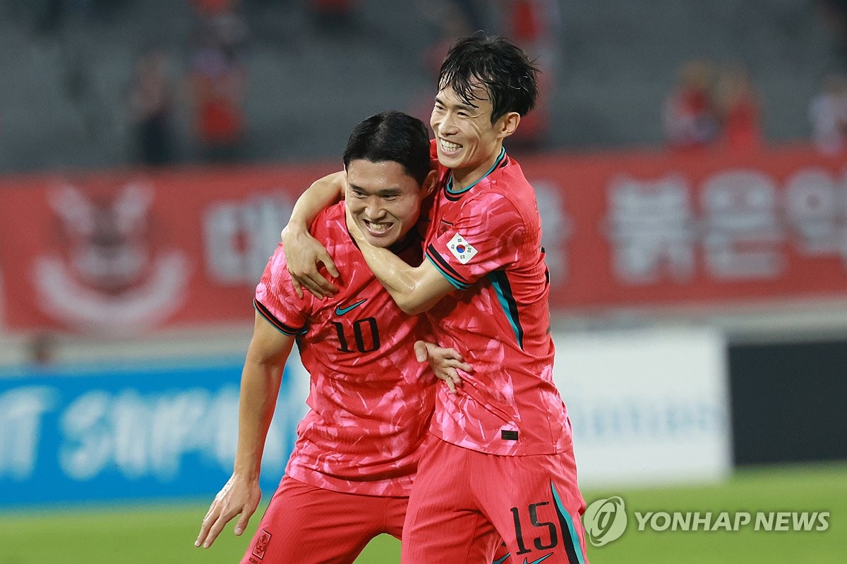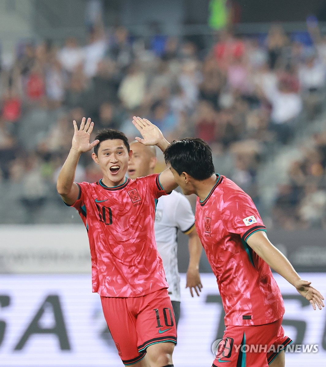 한국 이동경이 선취골을 넣고 김문환과 기뻐하고 있다. 2025.7.7 nowwego@yna.co.kr