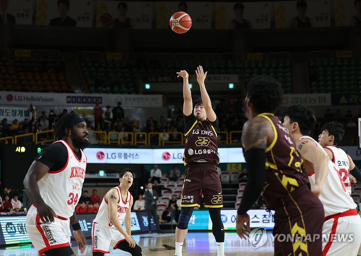 (창원=연합뉴스) 김동민 기자 = 27일 경남 창원체육관에서 열린 '2024-2025 KCC 프로농구' 창원 LG 세이커스와 서울 SK 나이츠 경기. LG 전성현이 점프슛하고 있다. 2024.11.27 image@yna.co.kr