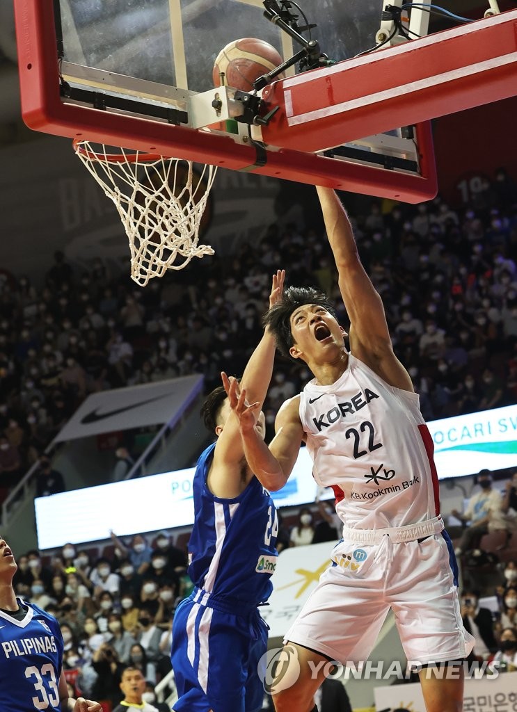(안양=연합뉴스) 홍기원 기자 = 17일 오후 경기도 안양실내체육관에서 열린 남자농구 국가대표 평가전 한국과 필리핀의 경기. 한국 여준석이 슛을 하고 있다. 2022.6.17 xanadu@yna.co.kr