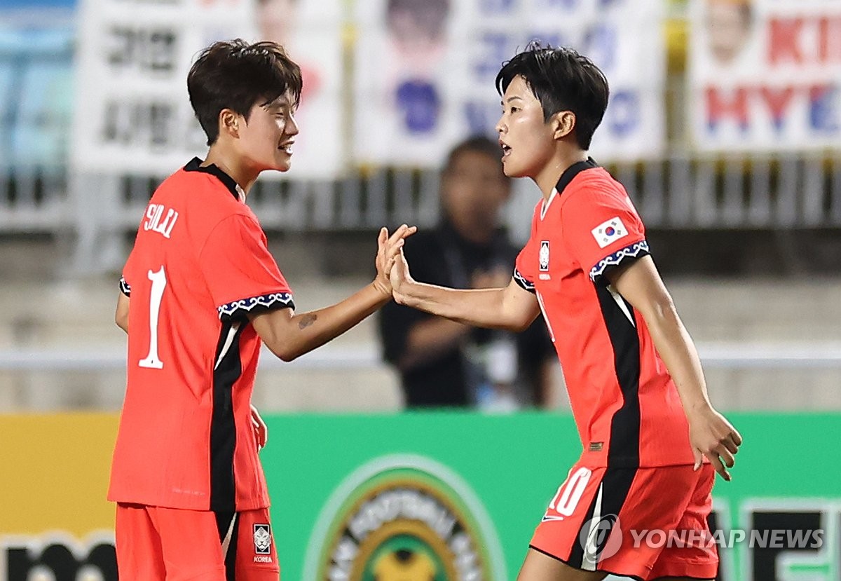 (수원=연합뉴스) 윤동진 기자 = 9일 수원월드컵경기장에서 열린 2025 동아시아축구연맹(EAFF) E-1 챔피언십(동아시안컵) 여자부 대한민국 대 중국 경기. 한국 지소연이 동점골을 넣은 후 동료들과 함께 기뻐하고 있다. 2025.7.9 mon@yna.co.kr