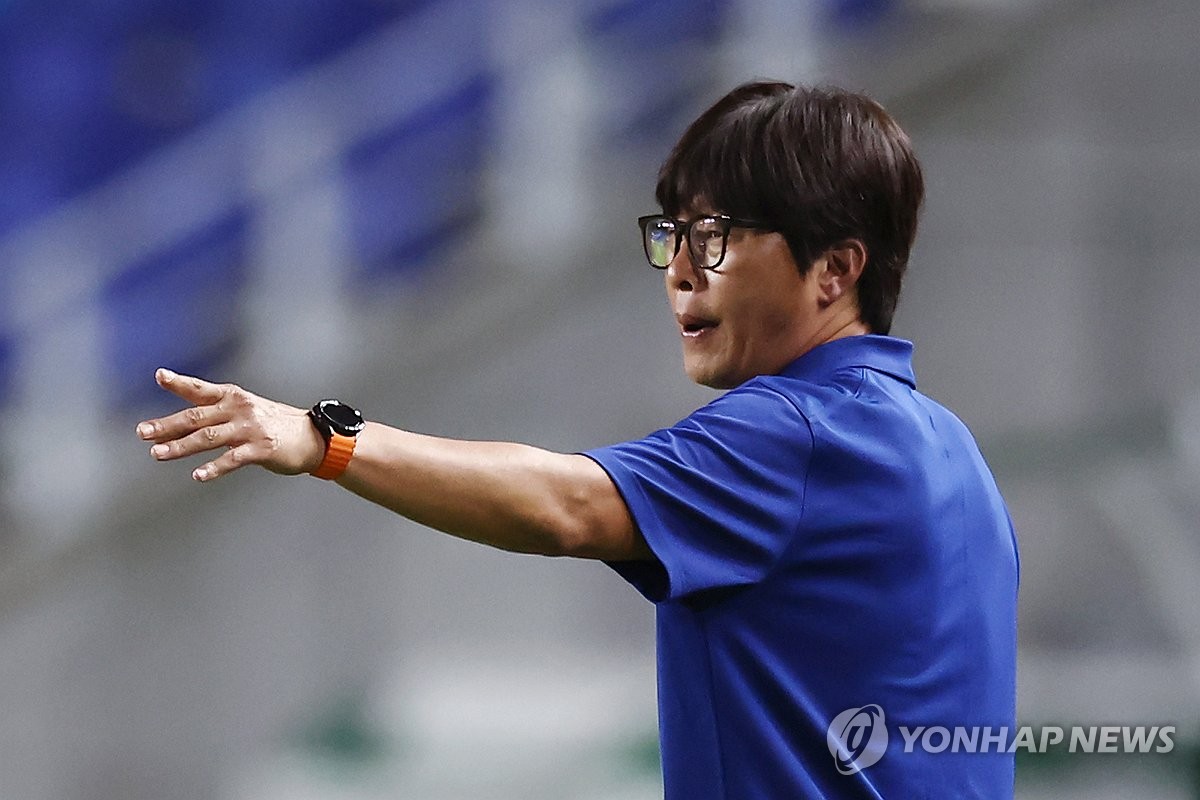 (서울=연합뉴스) 윤동진 기자 = 9일 수원월드컵경기장에서 열린 2025 동아시아축구연맹(EAFF) E-1 챔피언십(동아시안컵) 여자부 대한민국 대 중국 경기. 신상우 한국 여자축구대표팀 감독이 작전 지시를 하고 있다. 2025.7.9 mon@yna.co.kr