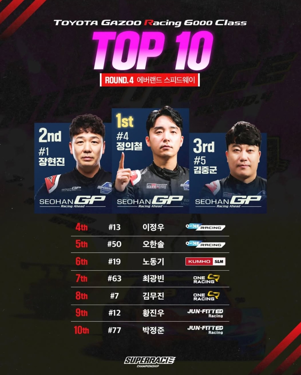정의철은 12일 저녁 용인 에버랜드 스피드웨이(2.538㎞·37랩)에서 '나이트 레이스로 펼쳐진 토요타 가주 레이싱 6000 클래스 4라운드 결승에서 50분 20초 510의 기록으로 가장 먼저 체커기를 받았다.