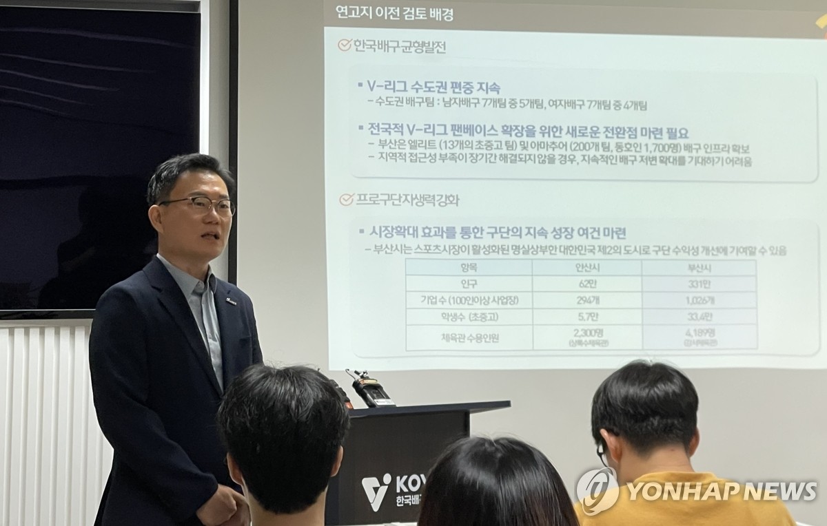 (서울=연합뉴스) 이대호 기자 = 권철근 OK저축은행 배구단 단장이 24일 서울 마포구 한국배구연맹에서 연고 이전 관련 브리핑을 하고 있다. 2025.6.24 4bun@yna.co.kr