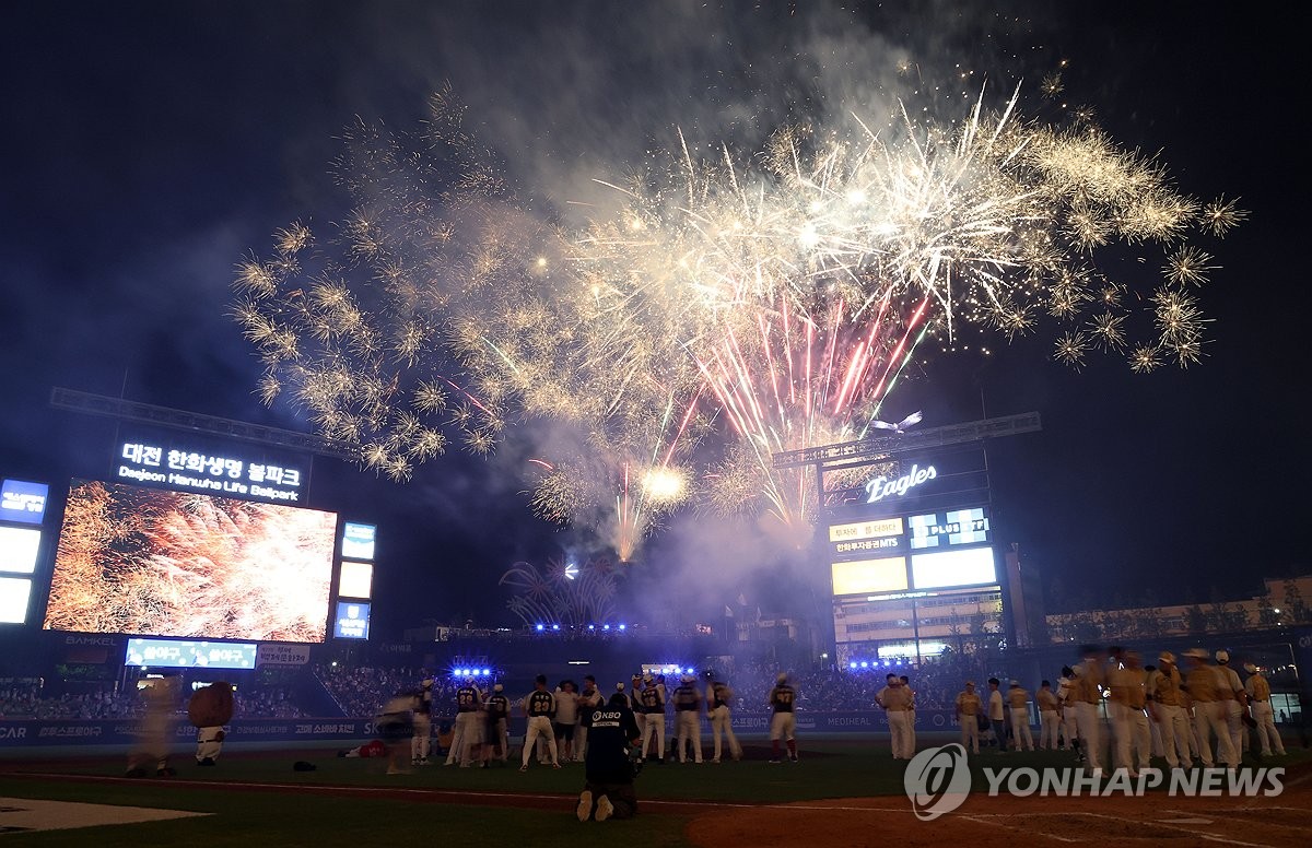(대전=연합뉴스) 김준범 기자 = 12일 대전 한화생명 볼파크에서 열린 2025 신한 SOL뱅크 KBO 올스타전이 끝난 뒤 폭죽이 터지고 있다. 2025.7.12 psykims@yna.co.kr
