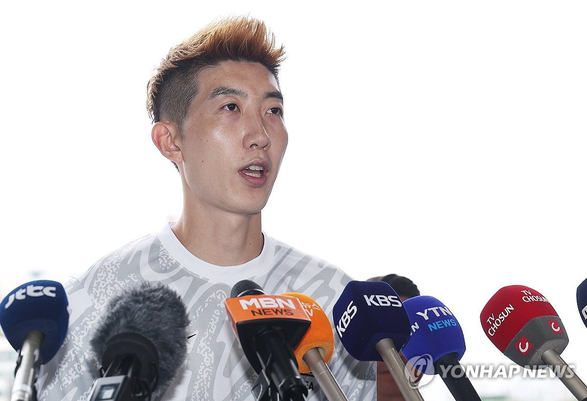 (성남=연합뉴스) 홍기원 기자 = 2025년 동아시아축구연맹(EAFF) E-1 챔피언십(동아시안컵) 남자부 3차전 일본과의 경기를 앞둔 축구 국가대표팀 주장 조현우가 14일 경기도 성남종합운동장에서 훈련에 앞서 취재진 질문에 답하고 있다. 2025.7.14 xanadu@yna.co.kr