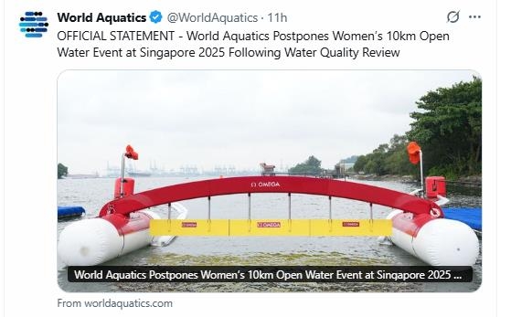 세계수영연맹(World Aquatics)은 15일(이하 한국시간) "경기장 수질 수준이 기준치를 초과해 대회 조직위원회와 오픈워터스위밍 여자 10㎞ 경기를 하루 연기하기로 했다"고 발표했다.