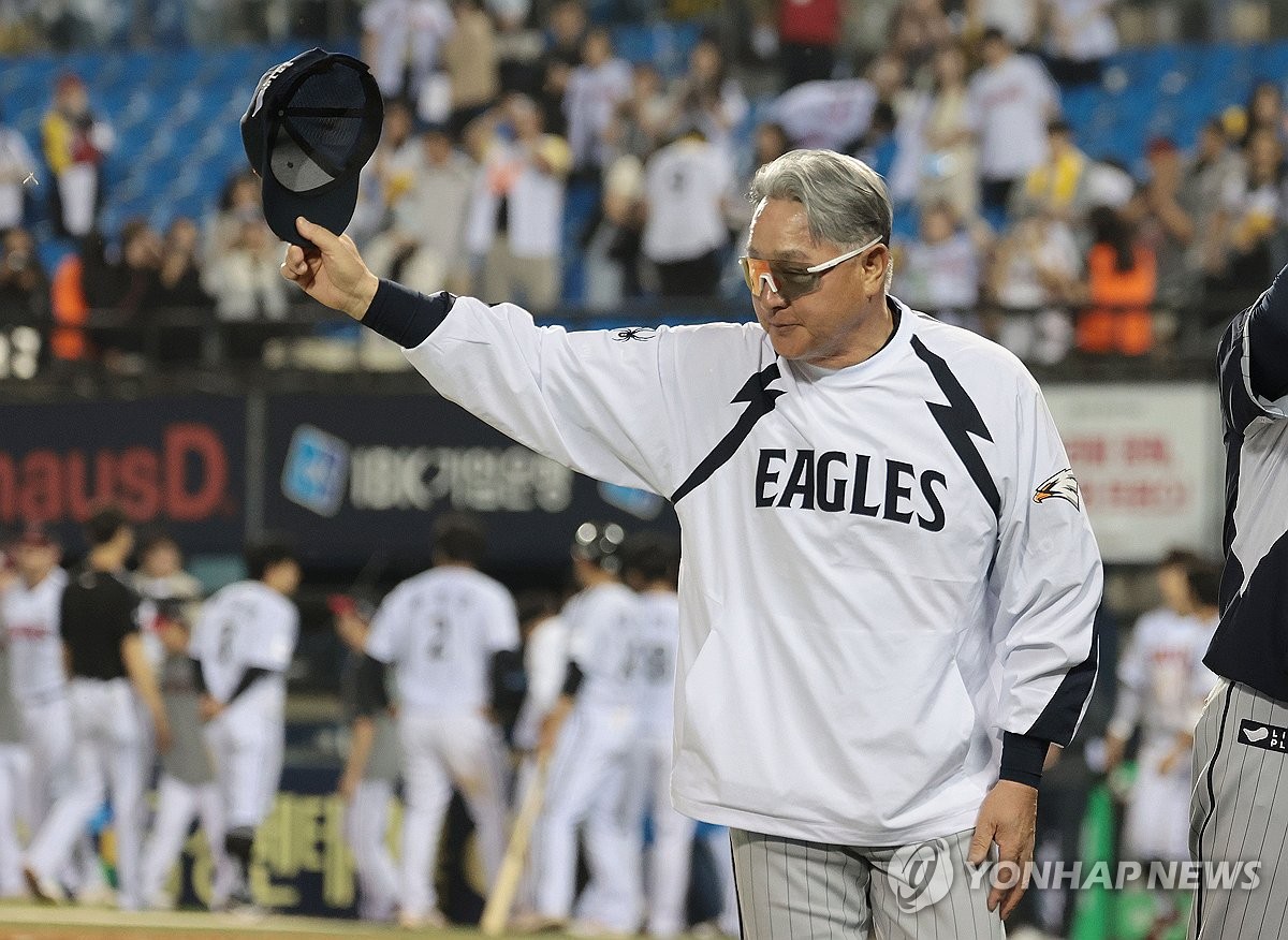(서울=연합뉴스) 김인철 기자 = 28일 서울 송파구 잠실야구장에서 열린 2025 프로야구 KBO리그 한화 이글스와 LG 트윈스의 경기. 연장전 11회 접전 끝에 6-5 승리를 거둔 한화의 김경문 감독이 인사하고 있다. 2025.5.28 yatoya@yna.co.kr