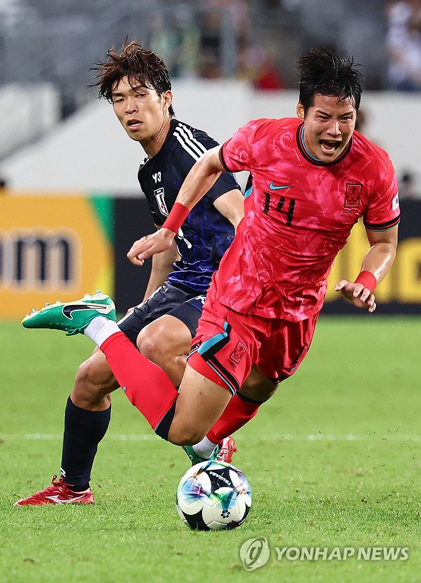 (용인=연합뉴스) 서대연 기자 = 15일 경기도 용인미르스타디움에서 열린 2025년 동아시아축구연맹(EAFF) E-1 챔피언십(동아시안컵) 남자부 최종 3차전 한국과 일본의 경기. 한국 박승욱이 넘어지고 있다. 2025.7.15 dwise@yna.co.kr