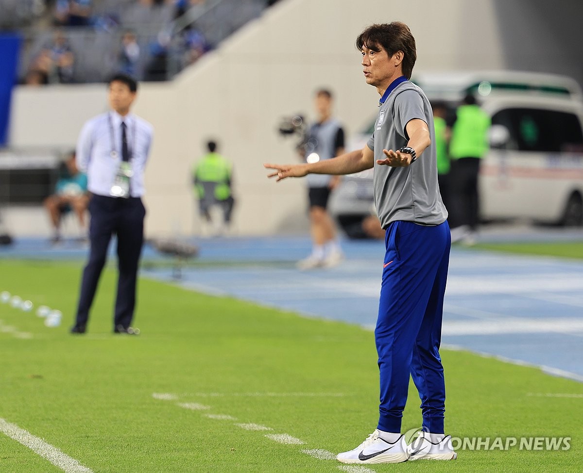 (용인=연합뉴스) 최재구 기자 = 15일 경기도 용인미르스타디움에서 열린 2025년 동아시아축구연맹(EAFF) E-1 챔피언십(동아시안컵) 남자부 최종 3차전 한국과 일본의 경기에서 한국 대표팀의 홍명보 감독이 작전 지시를 하고 있다. 2025.7.15 jjaeck9@yna.co.kr