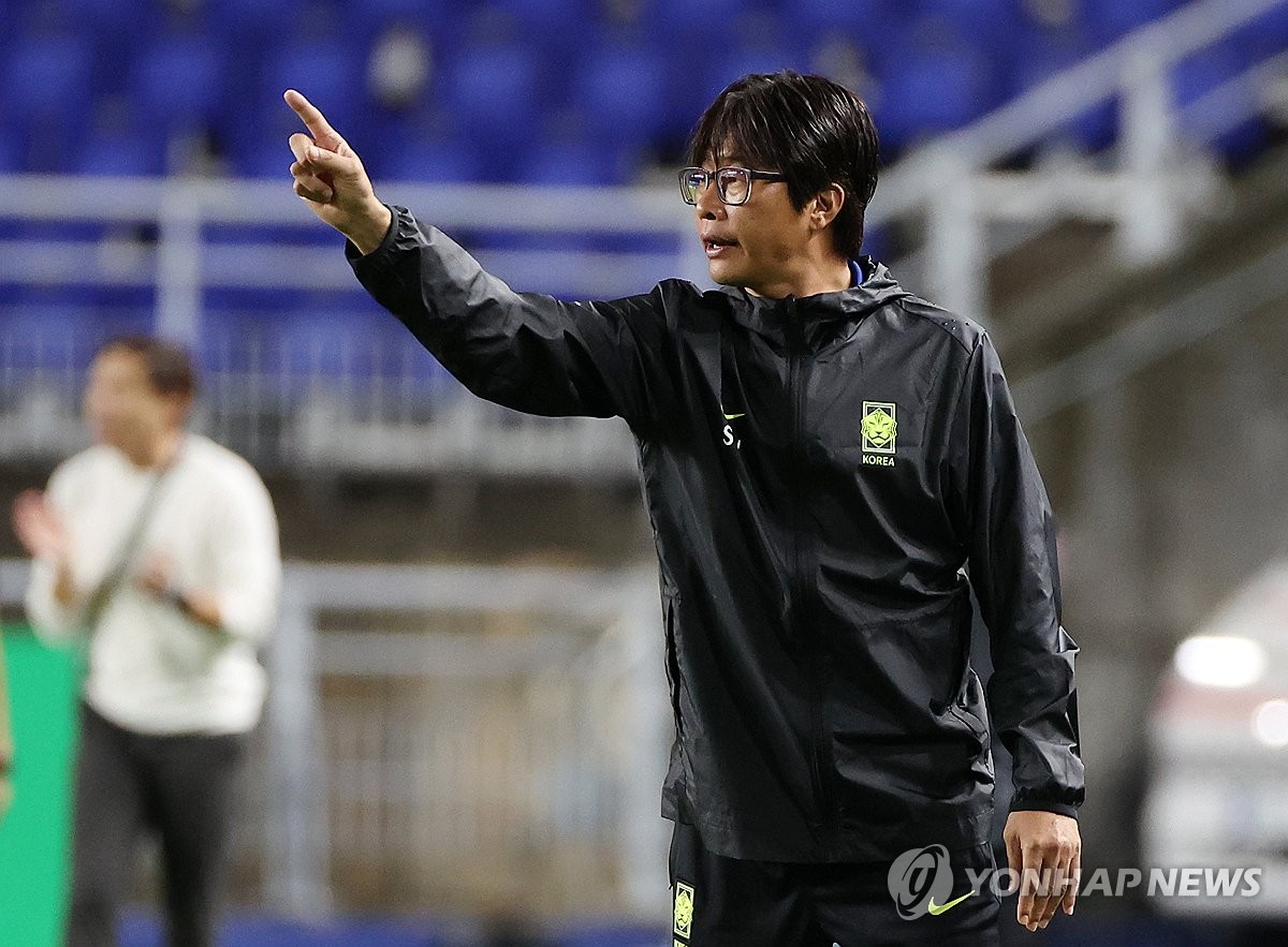 (수원=연합뉴스) 홍기원 기자 = 16일 수원월드컵경기장에서 열린 2025 동아시아축구연맹(EAFF) E-1 챔피언십(동아시안컵) 여자부 대한민국 대 대만 경기. 신상우 여자 축구 대표팀 감독이 작전지시를 하고 있다. 2025.7.16 xanadu@yna.co.kr