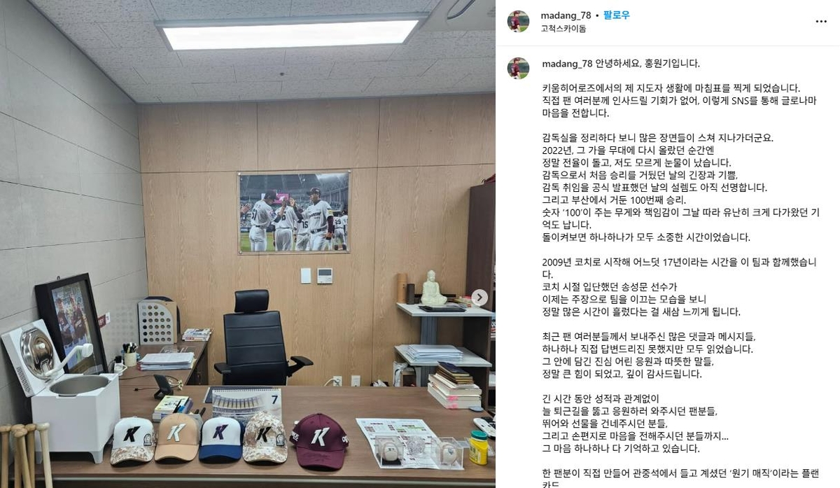 홍 전 감독은 16일 인스타그램 계정에 "직접 팬 여러분께 인사드릴 기회가 없어서 글로 마음을 전한다"며 "감독실을 정리하다 보니 많은 장면이 스쳐 지나간다"고 회상했다.