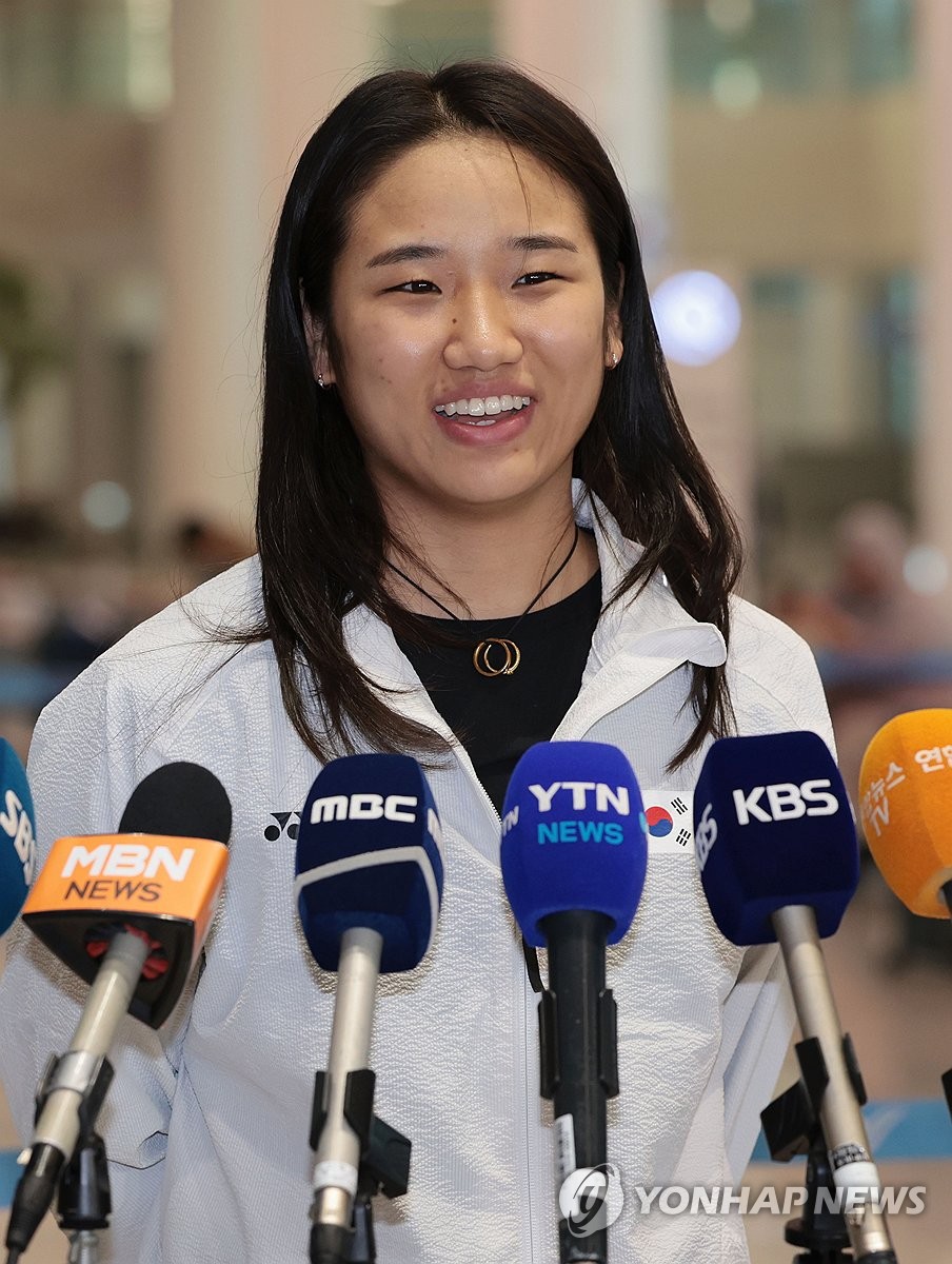 (영종도=연합뉴스) 김인철 기자 = 세계배드민턴연맹(BWF) 월드투어 슈퍼 1000 인도네시아오픈 여자 단식 결승에서 우승을 차지한 안세영이 9일 인천국제공항 제2여객터미널로 귀국한 뒤 인터뷰를 하고 있다. 2025.6.9 yatoya@yna.co.kr