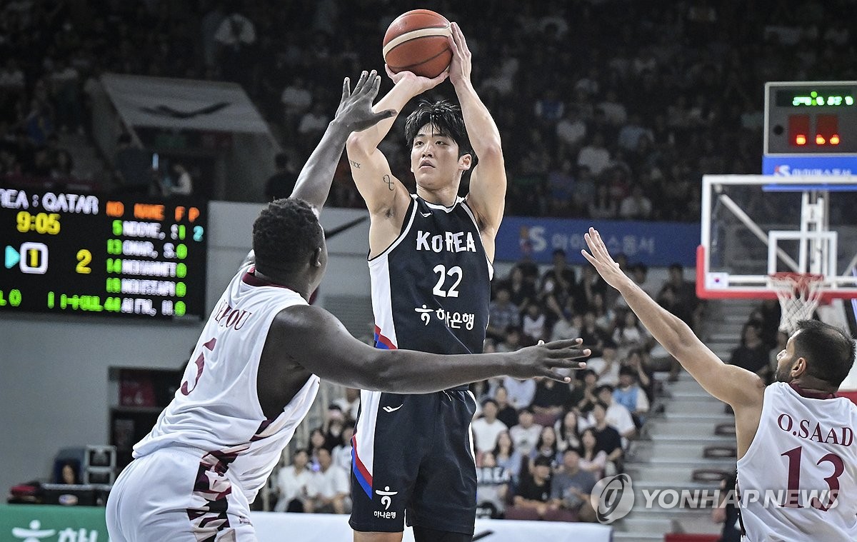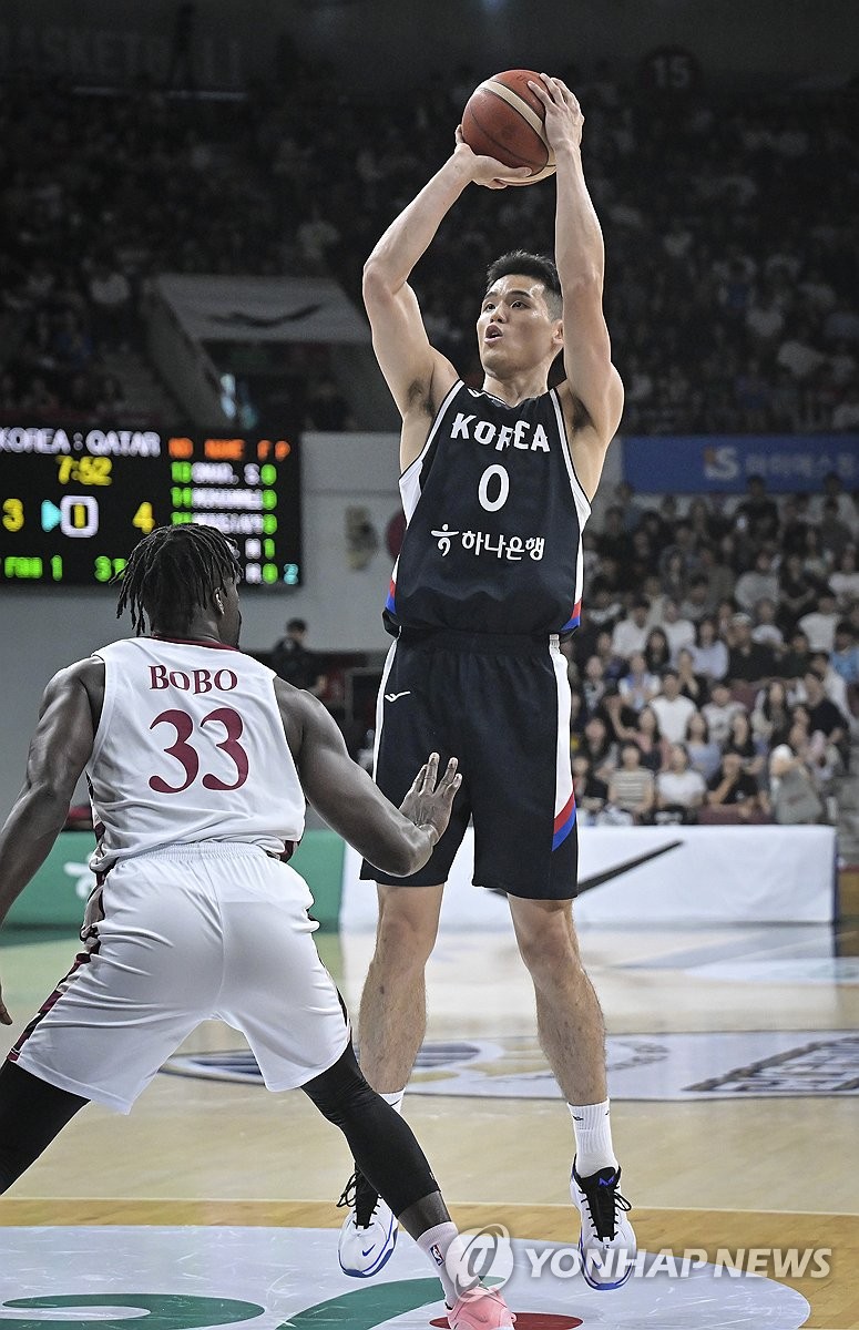 (서울=연합뉴스) 20일 경기도 안양정관장아레나에서 열린 하나은행 초청 2025 남자농구 국가대표 평가전 카타르와의 경기에서 하윤기가 슛을 하고 있다. 2025.7.20 [대한민국농구협회 제공, 재판매 및 DB 금지] photo@yna.co.kr