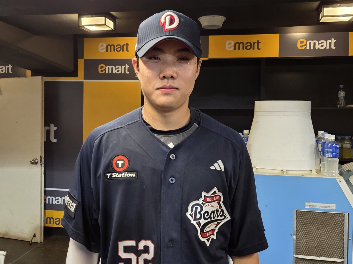 (인천=연합뉴스) 하남직 기자 = 두산 내야수 박준순이 20일 인천 SSG랜더스필드에서 열린 프로야구 SSG와 방문 경기에서 9회 결승타를 친 뒤, 취재진과 인터뷰하고 있다.