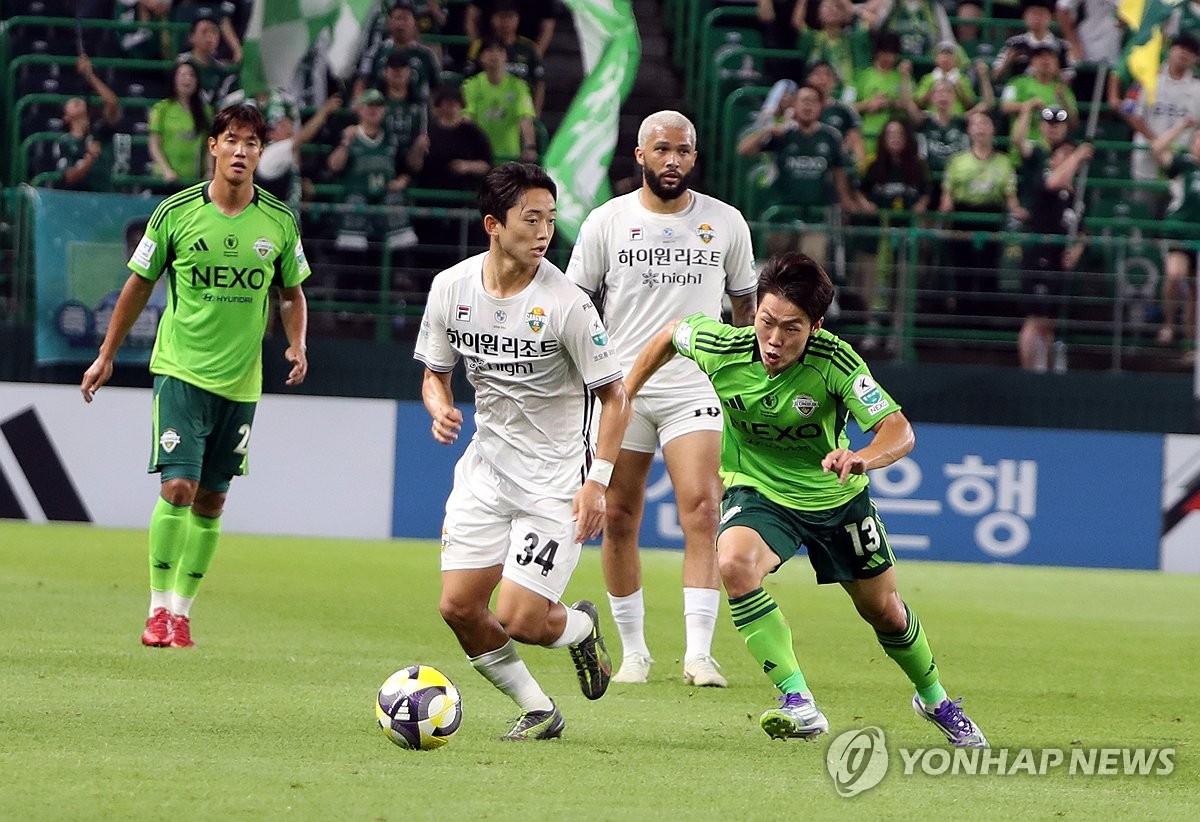 (전주=연합뉴스) 나보배 기자 = 23일 전북 전주월드컵경기장에서 열린 하나은행 K리그1 2025 전북현대와 강원FC의 경기. 전북 현대 강상윤과 강원FC 송준석이 볼다툼을 하고 있다. 2025.7.23 warm@yna.co.kr