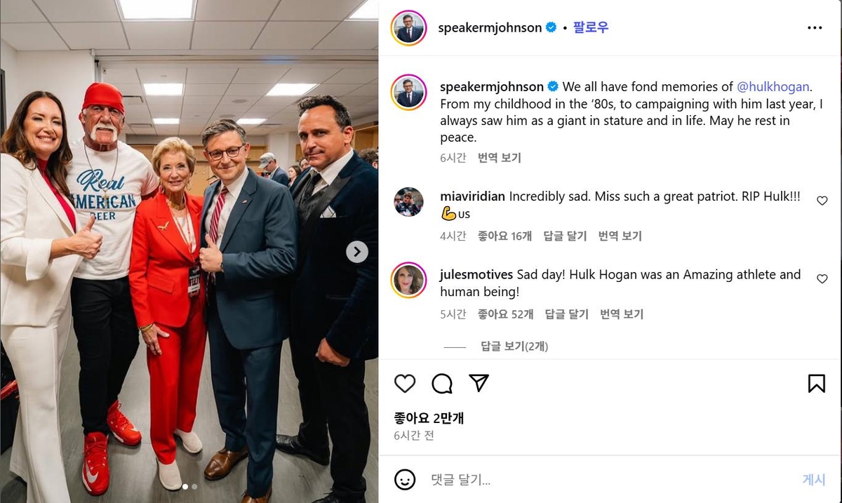 마이크 존슨 미 하원의장도 인스타그램에 호건과 함께 찍은 사진을 올리고 "80년대 어린 시절부터 작년에 그와 함께 선거운동을 할 때까지 나는 항상 그를 거인으로 보았다"며 "고인의 명복을 빈다"고 썼다.