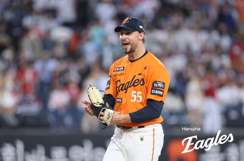(서울=연합뉴스) 한화 외국인 투수 와이스가 25일 대전 한화생명볼파크에서 열린 프로야구 SSG와 홈 경기에 선발 등판해, 상대 타자를 범타 처리한 뒤 기뻐하고 있다. [한화 이글스 제공. 재판매 및 DB금지]